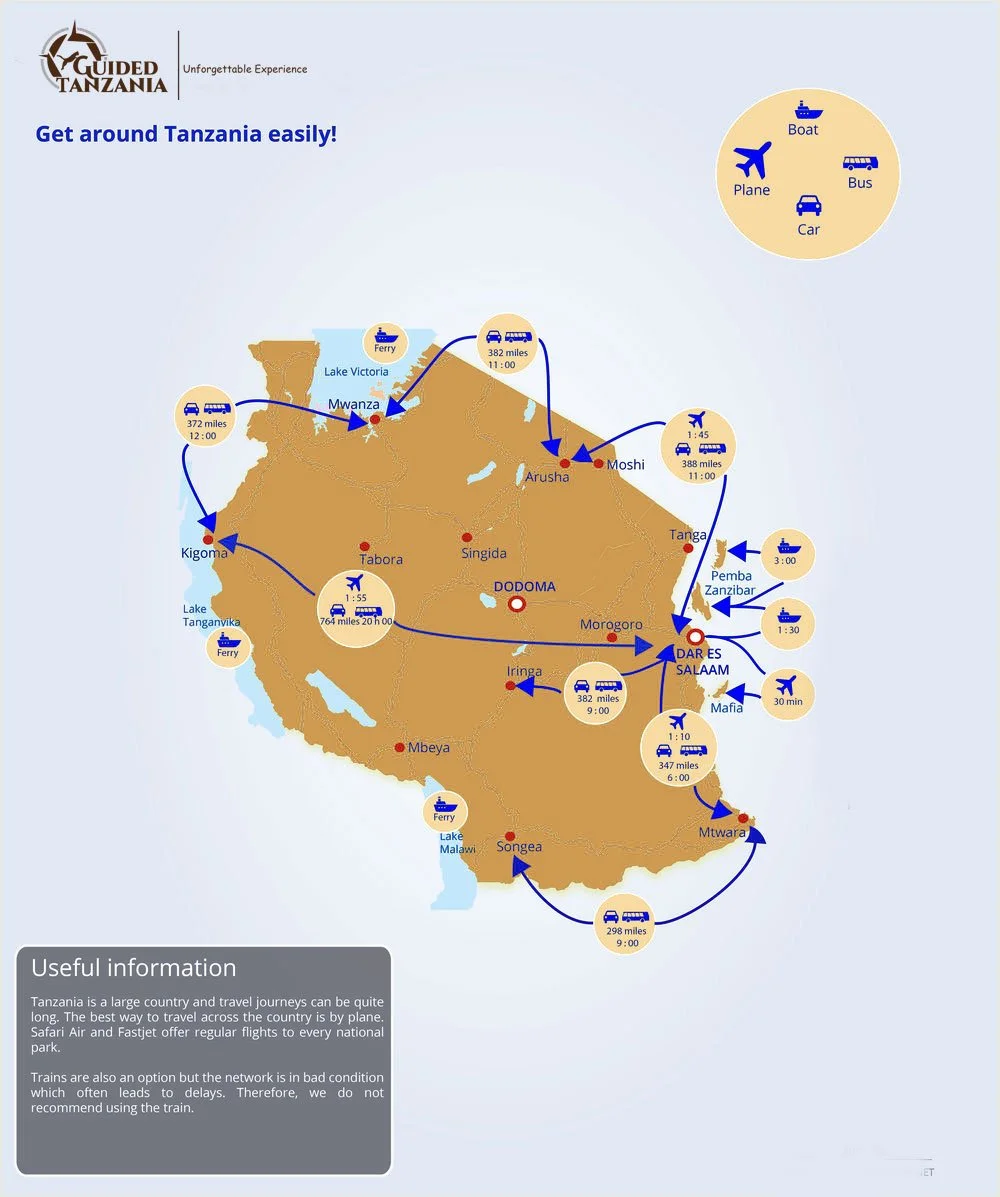 There are many ways to get around during your stay in Tanzania. With a surface area twice as large as France, travel times can be long. The fastest and most comfortable mode of travel is by plane or helicopter. The country has three international airports: Dar Es Salaam, Zanzibar and Kilimanjaro as well as a dozen local airports. Arusha airport, in the north of the country, is very busy; It has regular flights to the Northern National Parks, Zanzibar Island and Dar es Salaam. For those on a tight budget, there are also smaller companies serving national parks and nature reserves with their own airstrips.